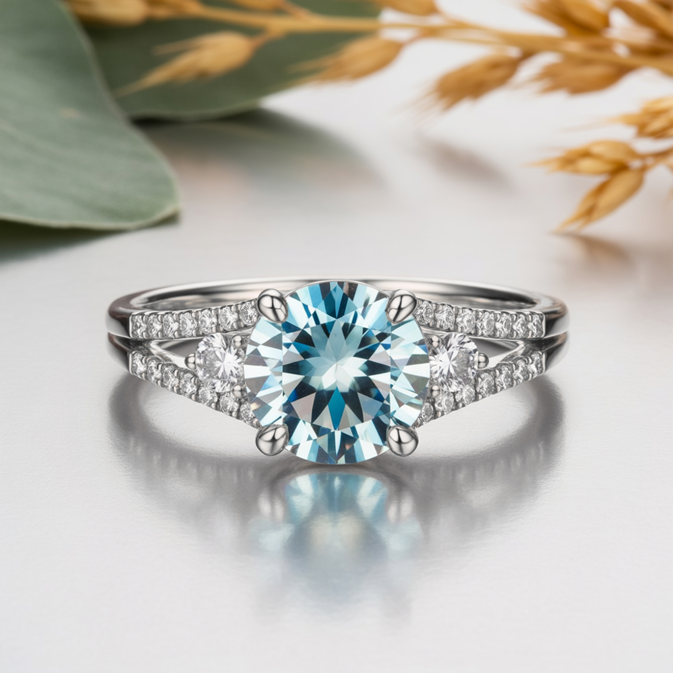 For those drawn to balance and brilliance, The Azura is a perfect harmony of elegance and luminosity. Featuring a 2CT round cut light blue gemstone at center, flanked by twin side stones and a split pavé band, it’s a design made to flatter the hand—and turn heads. Whether it marks a promise, proposal, or personal milestone, this ring speaks volumes with grace and clarity.