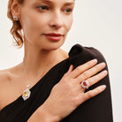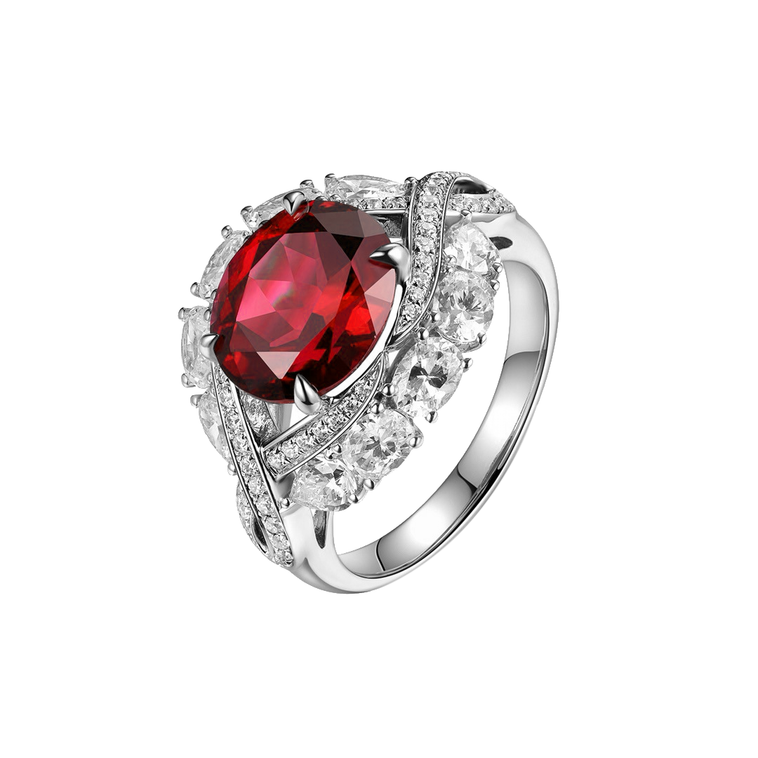 A vintage-inspired Ruby ring with intricate halo details, exuding timeless charm. Perfect for anniversaries or formal dinners. Matches perfectly with black evening dresses and diamond chokers for a classic look.