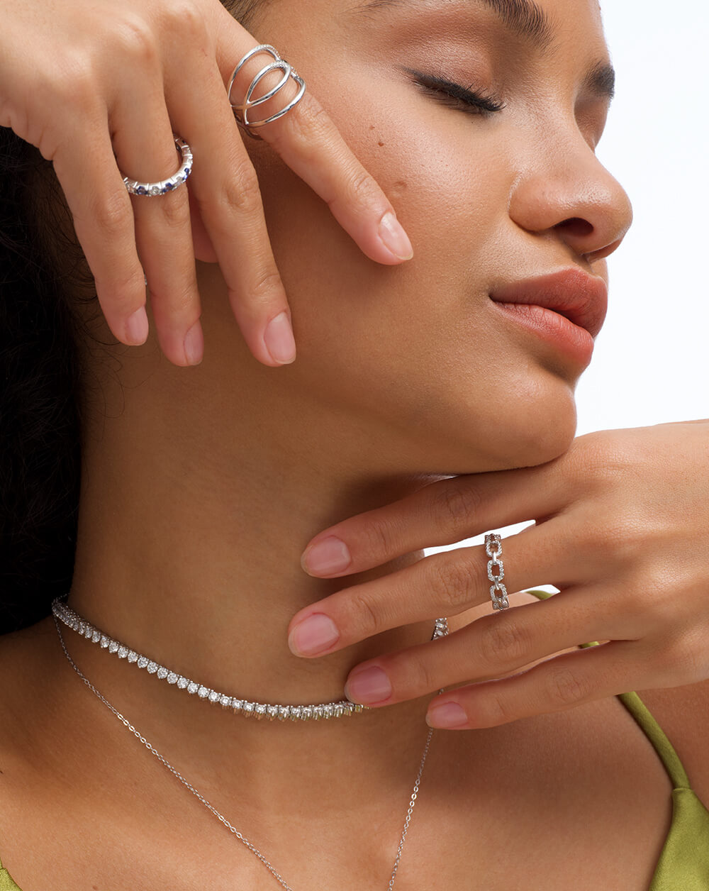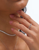 This silver chain-link eternity ring with sparkling stones symbolizes unity and elegance. Perfect for parties, workdays, or casual wear. A thoughtful gift for birthdays or friendships. Pair with silver necklaces or stud earrings to complete your modern, stylish look.