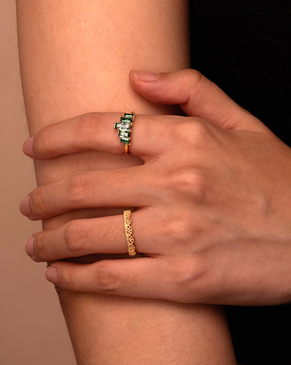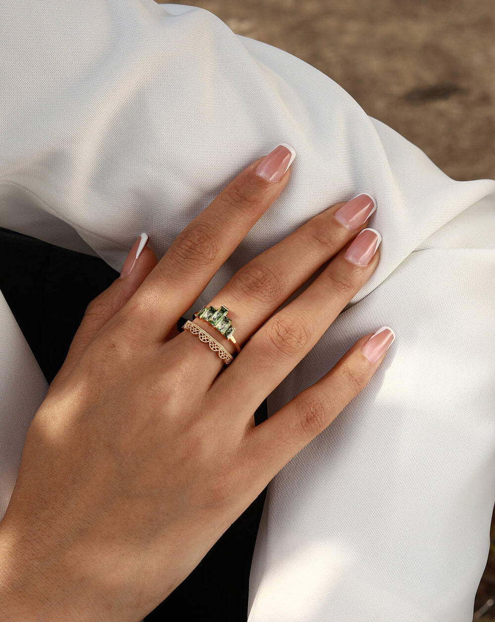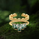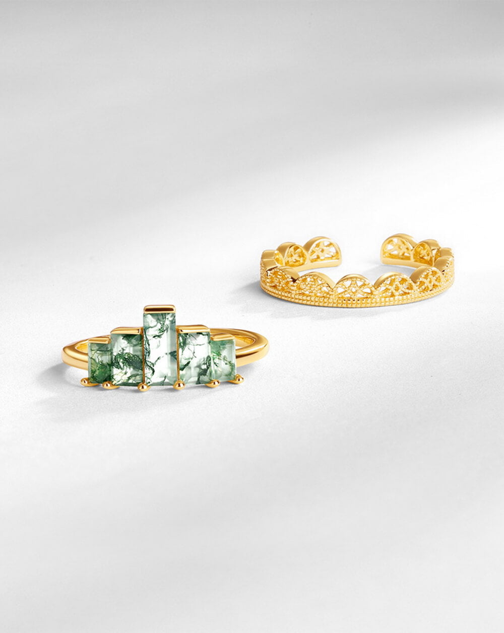 This Gold Crown Stack Moss Agate Engagement Ring blends regal elegance with natural symbolism. Crafted from 925 silver plated with 10K gold, the crown-shaped design features a polished moss agate stone known for grounding energy and vitality. The gold-accented bar adds opulent detail, while the stackable band allows seamless pairing with other rings. Perfect for daily wear or special occasions, its green inclusions symbolize growth and harmony, making it a timeless luxury piece for modern royalty.