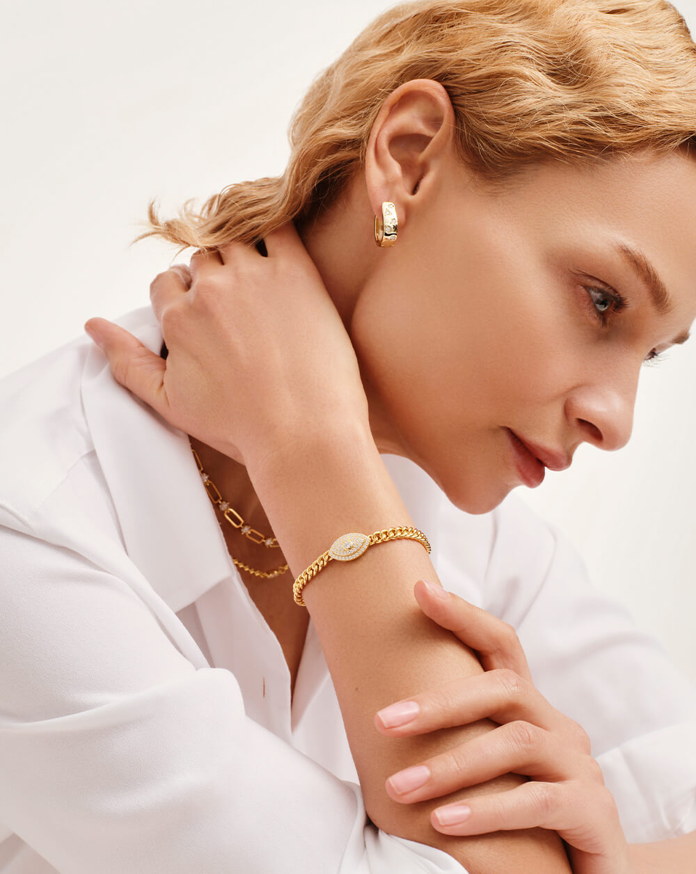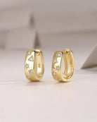 Radiant gold huggie earrings with starburst and geometric diamond accents, symbolizing guidance and brilliance. Perfect for office, parties, or gifts. Pair with a white blouse, gold bangle, and nude heels for timeless elegance.