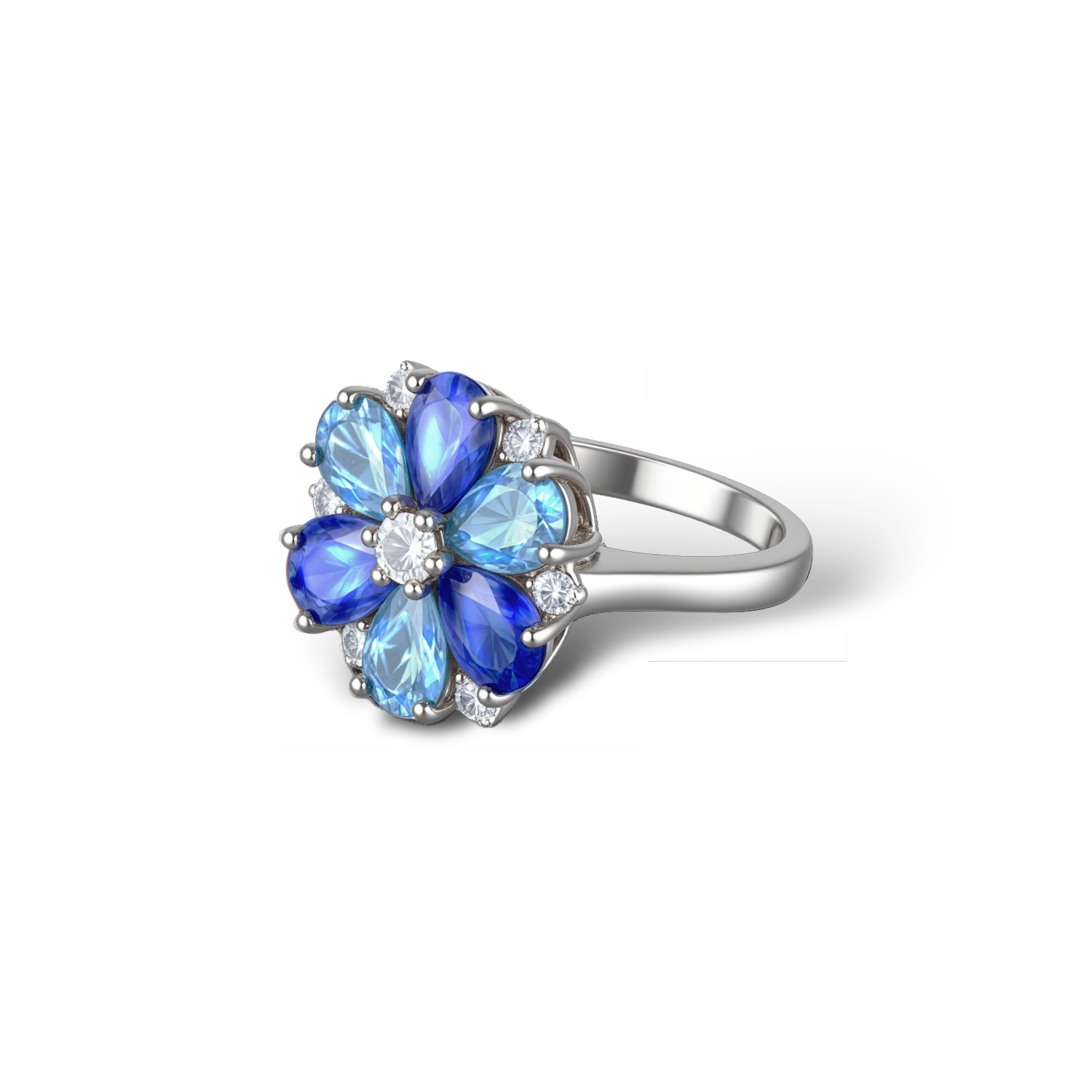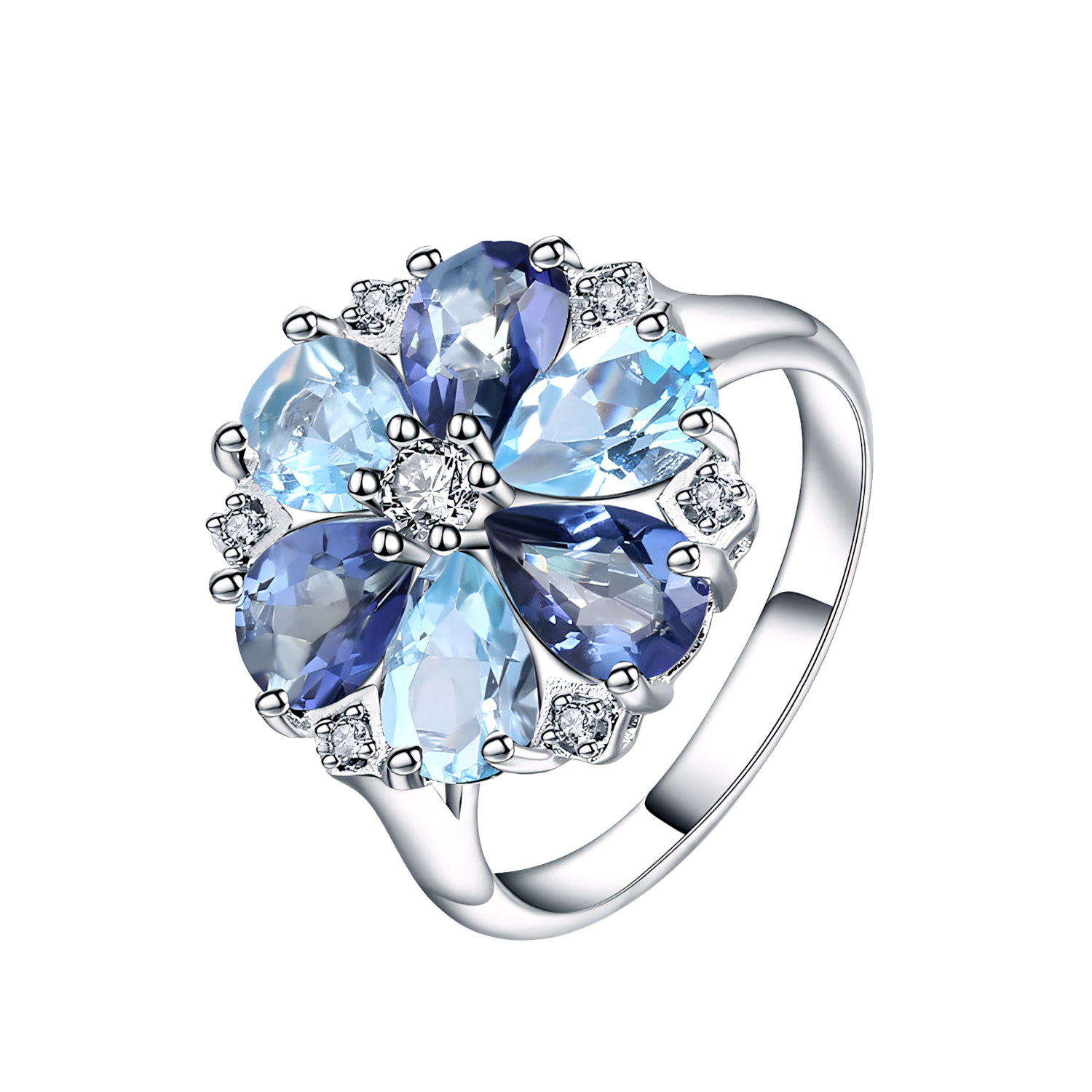 This exquisite six-petal flower ring features natural blue topaz, symbolizing peace and clarity. Perfect for parties, evening events, or daily elegance. Ideal as a birthday, anniversary, or special occasion gift. Pair with a navy dress, silver necklace, and diamond studs for a polished, refined look.