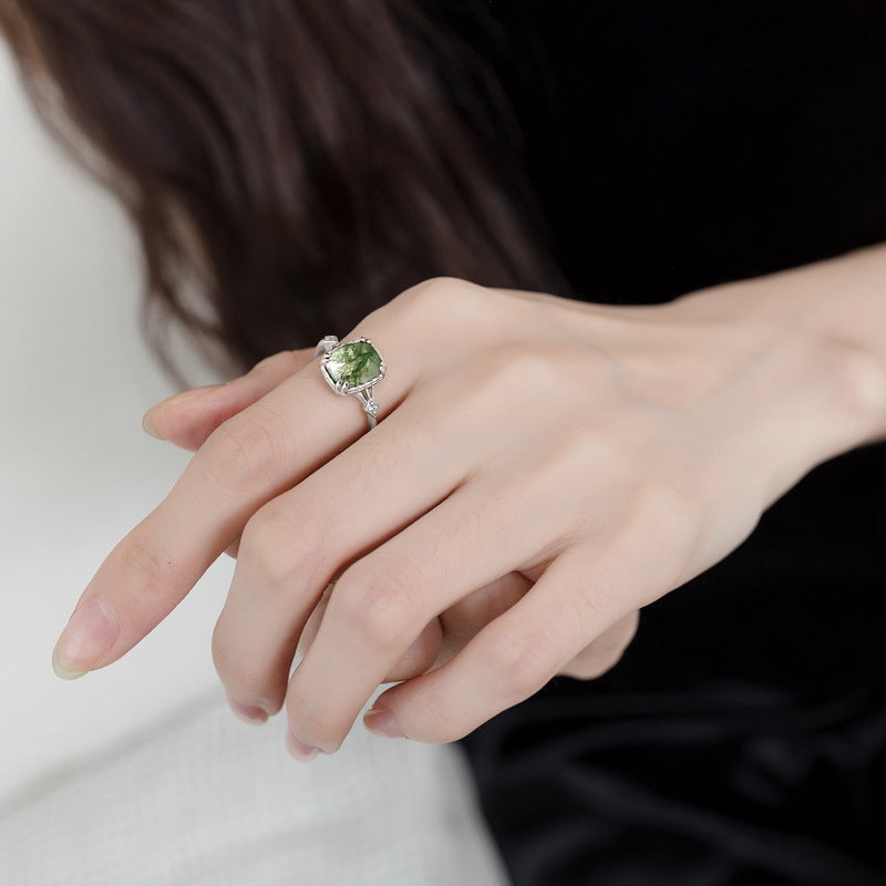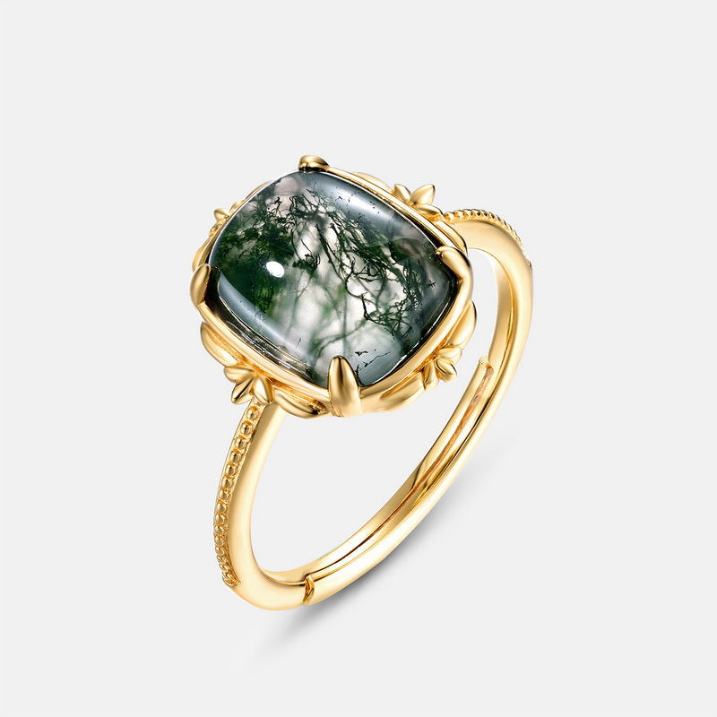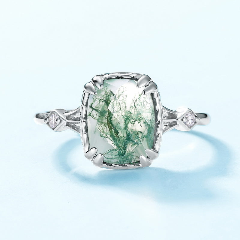 This Minimalist Geometric Moss Agate Solitaire Ring blends modern design with natural beauty, featuring a central moss agate cut into a geometric pattern with organic green inclusions symbolizing growth, set in a sleek 925 silver band for a timeless minimalist look. Available in white gold plated 925 silver for versatile daily wear, or 10K gold plated 925 silver to add a warm, luxurious touch for special occasions, the ring is perfect for stacking or solo wear, highlighting the gemstone’s unique charm.
