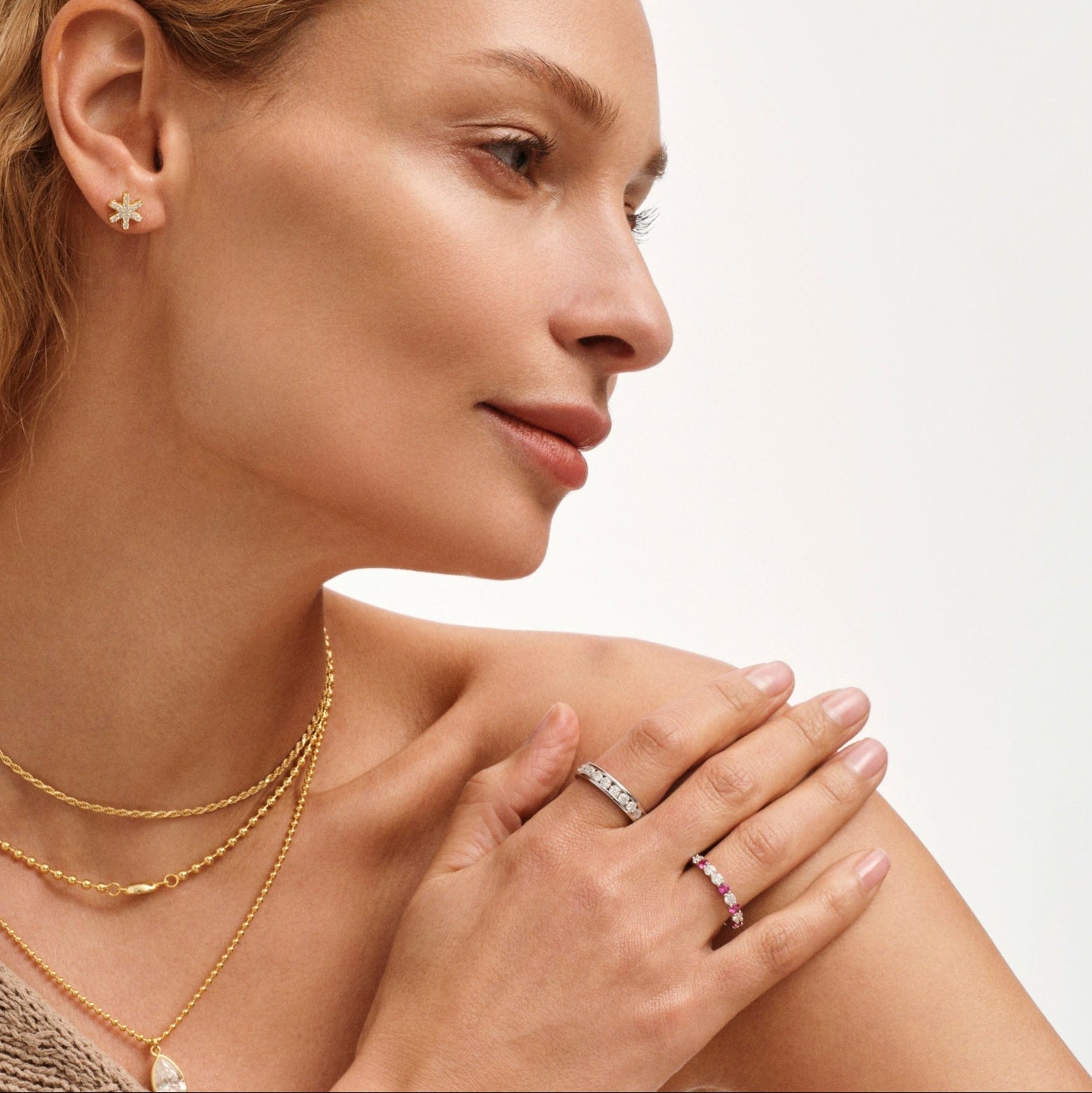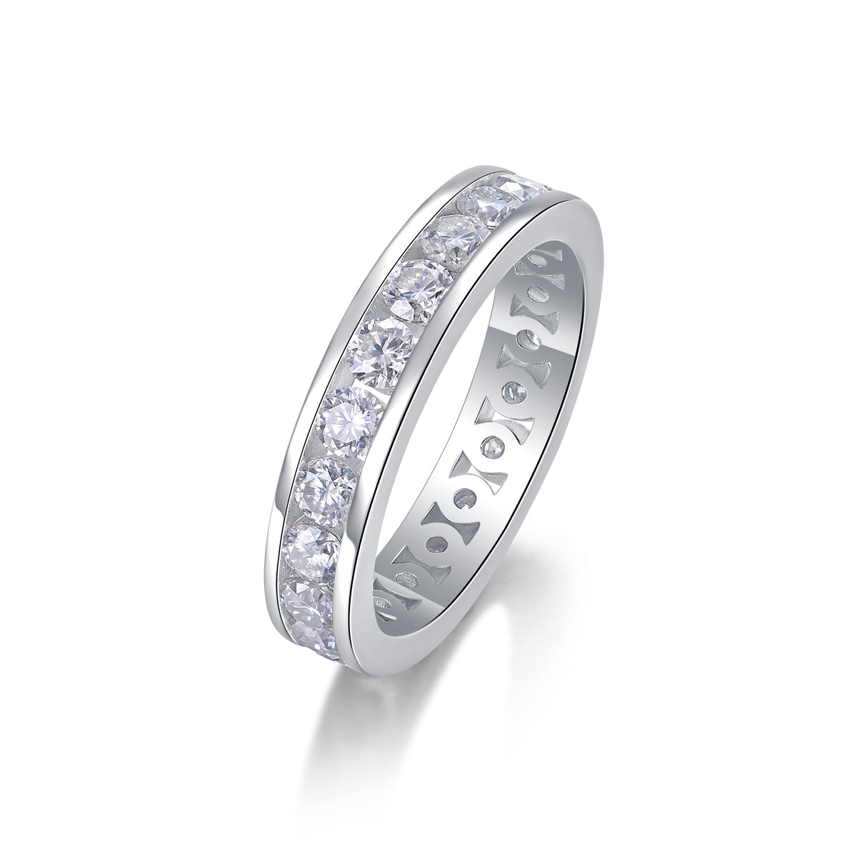 This sleek silver round-cut eternity band features a clean, modern design symbolizing everlasting love. Ideal for daily wear or minimalist office looks, it’s a perfect anniversary gift. Pair it with tailored outfits and silver stud earrings for understated elegance.