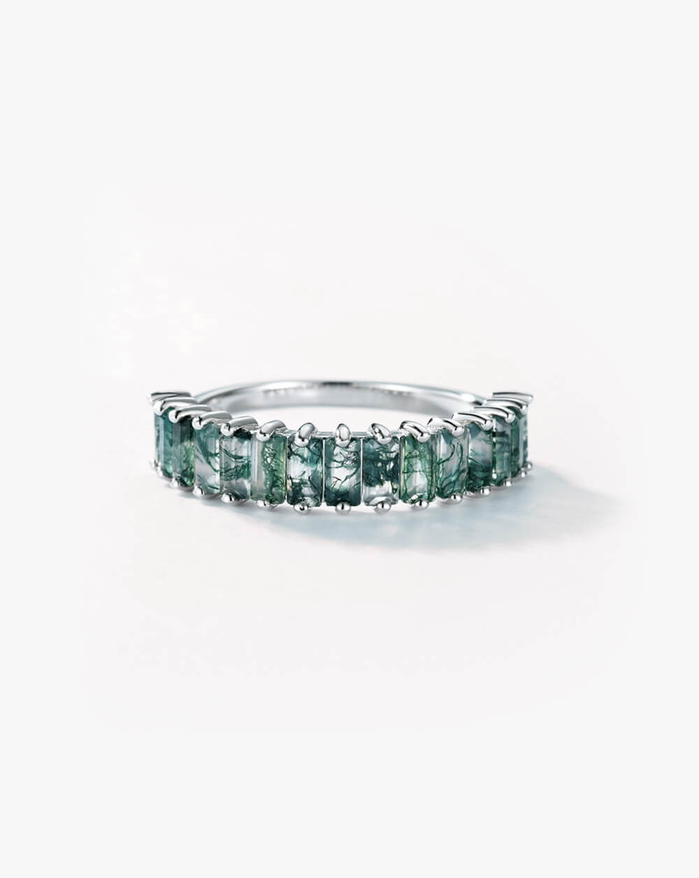 Each moss agate stone reveals delicate, organic patterns in soothing green hues, reminiscent of sun-dappled forests and misty morning landscapes. The clean lines of baguette-cut emeralds add a touch of refined sophistication, creating a perfect harmony between raw beauty and modern design. Whether worn as a statement piece or a subtle daily treasure, this ring brings a sense of calm, connection, and timeless grace. For those who find magic in nature's quiet details—wear it as a reminder of the world's serene, enduring beauty.