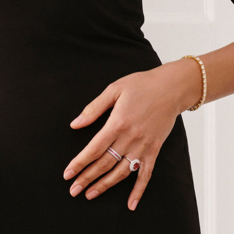 A dazzling circle of fiery rubies and moissanites embodies everlasting love and passion. Perfect for date nights, office style, or weekend sophistication. Great for birthdays, engagement celebrations, or romantic gifts. Style with a deep red dress, diamond studs, and a simple gold chain for timeless allure.