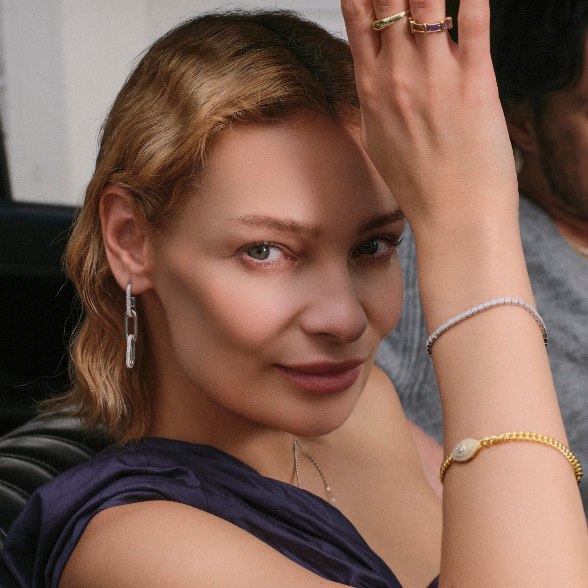 Bold yet refined, these triple-layer paperclip-inspired diamond earrings symbolize strength and connection. Perfect for parties, work, or casual glam. A stellar gift for milestones or friendships. Pair with a black satin blouse, gold cuff, and layered chain necklaces for modern elegance