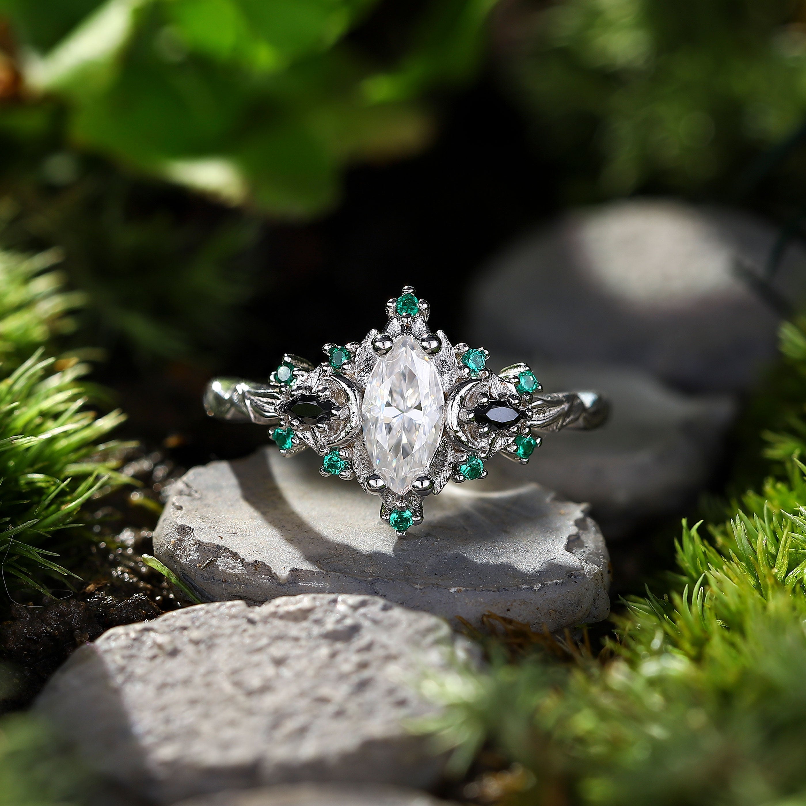 Unique Briar Moon Three Stone Marquise Moissanite and Lab Emerald Ring