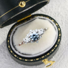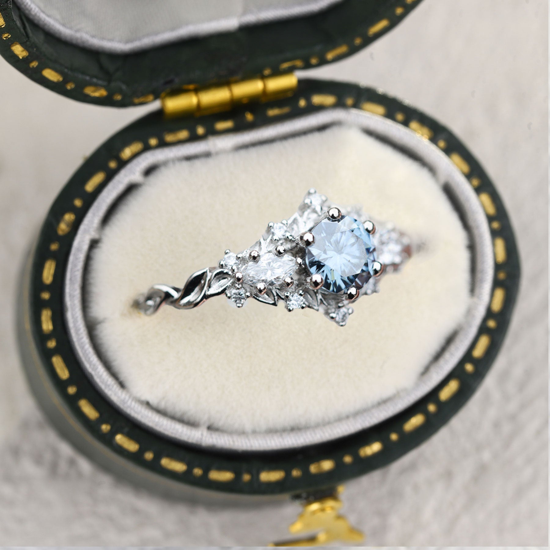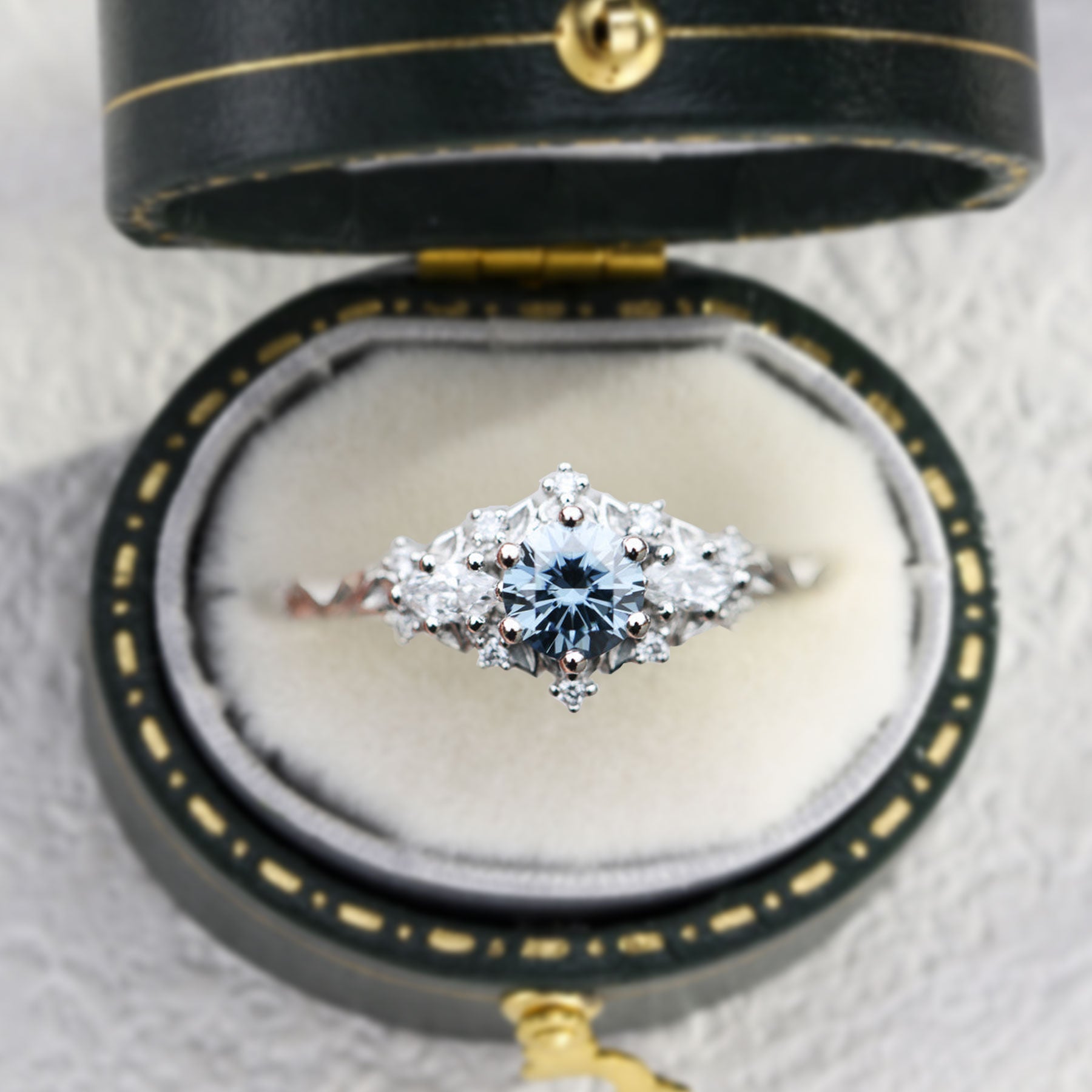 Unique Briar Rose Three Stone Round Grey Blue Moissanite Ring