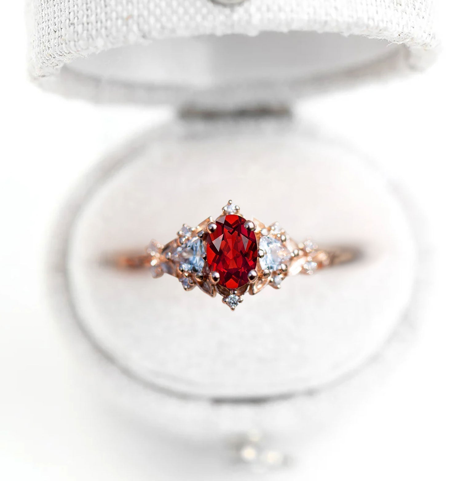 Unique Briar Rose Oval Garnet and Moissanite Ring