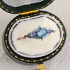 Unique Briar Rose Three Stone Round Lab Aquamarine and Tanzanite Ring