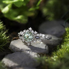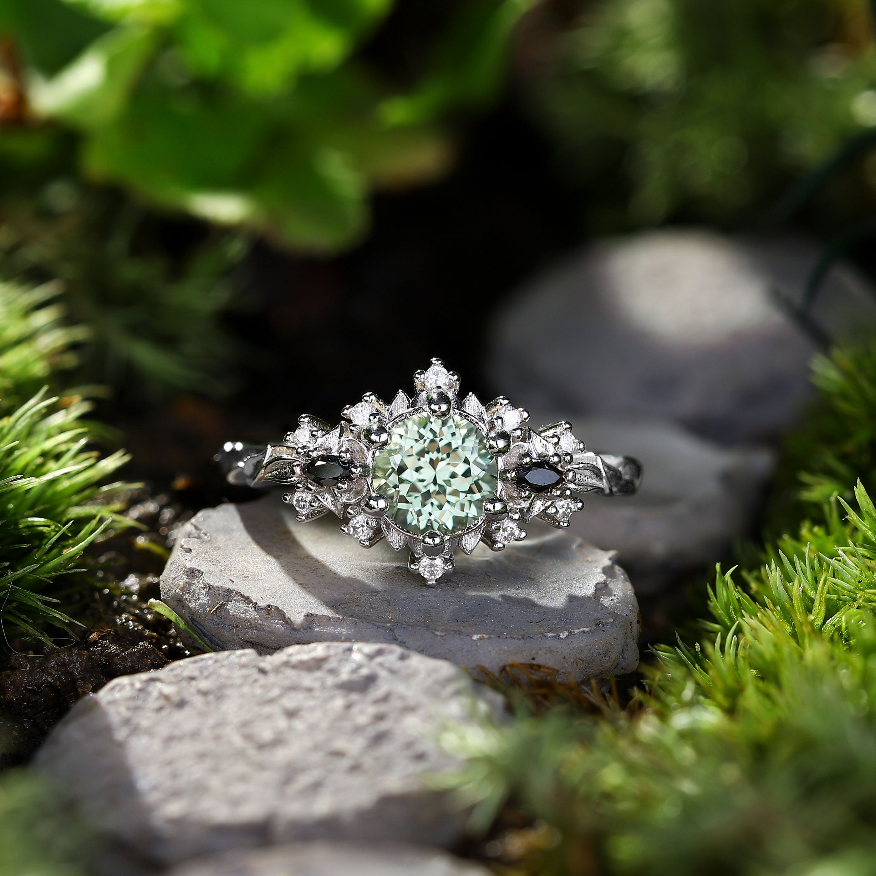 Unique Briar Rose Round Green Lab Sapphire and Black Moissanite Ring