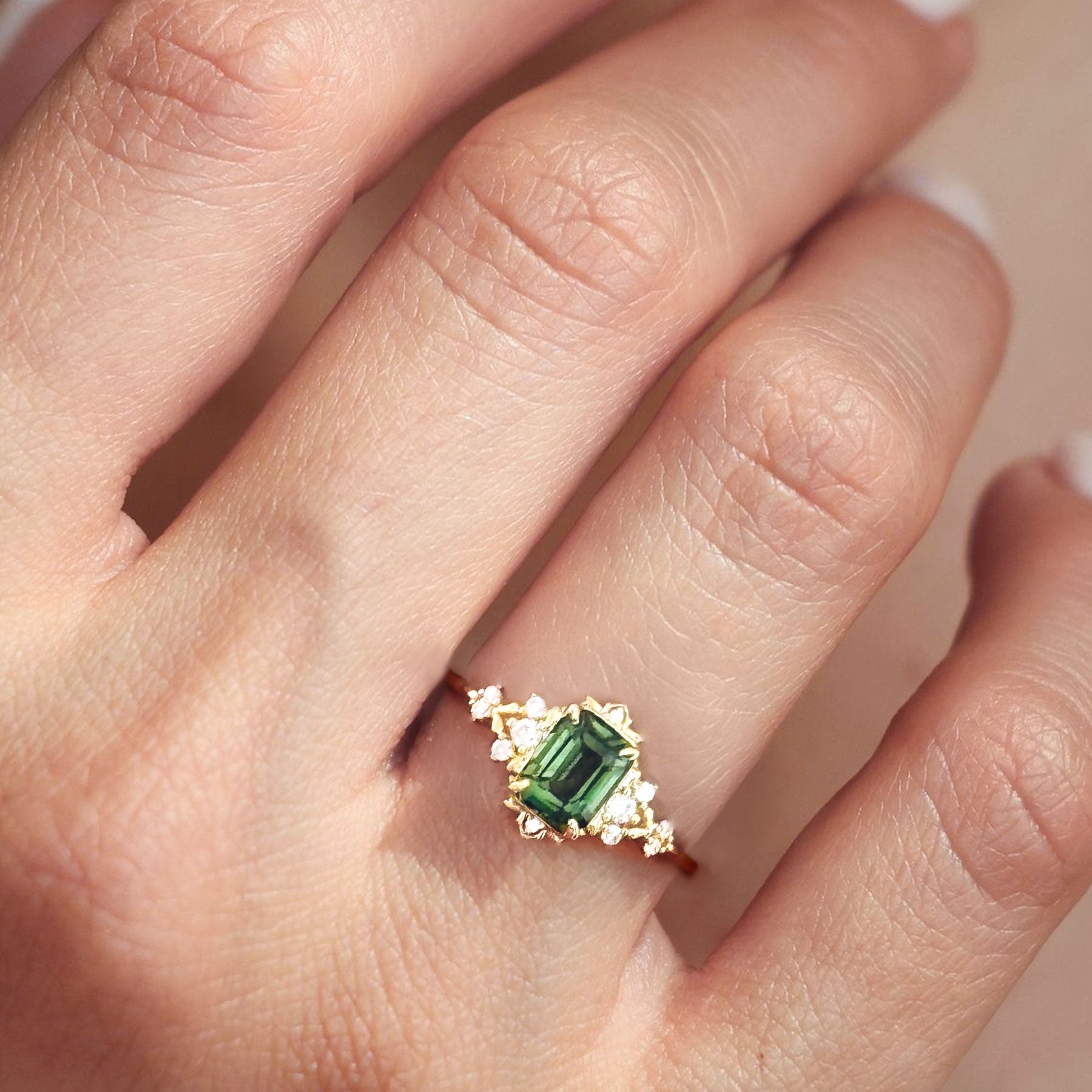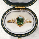 Vintage Fantasy Inspired Emerald Cut Green Lab Sapphire Engagement Ring