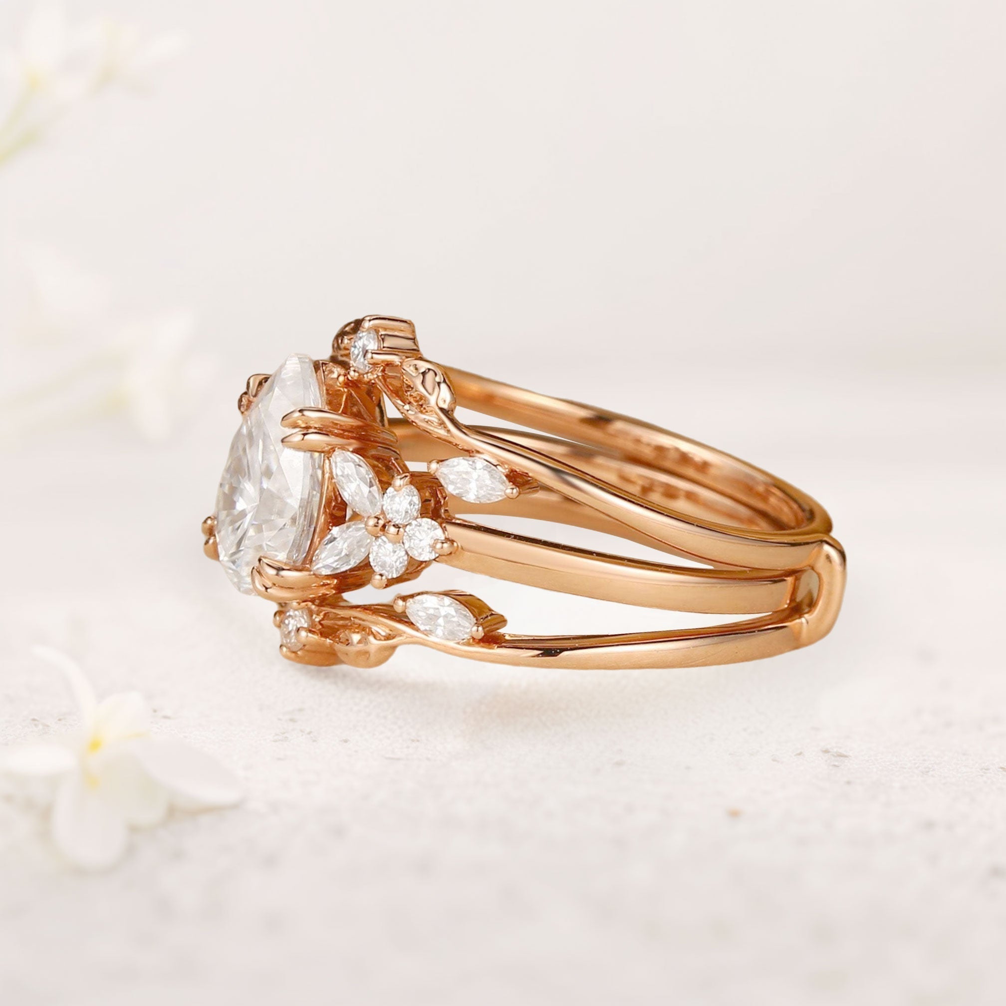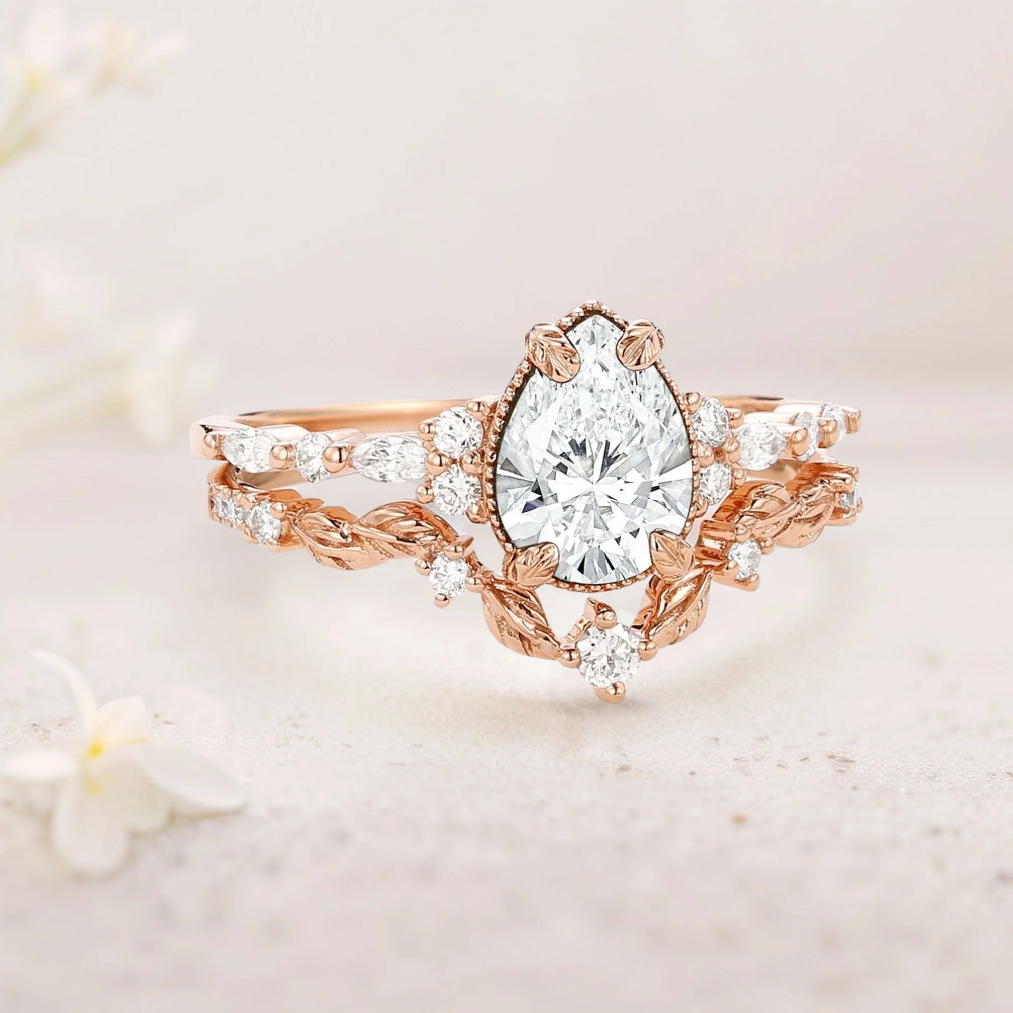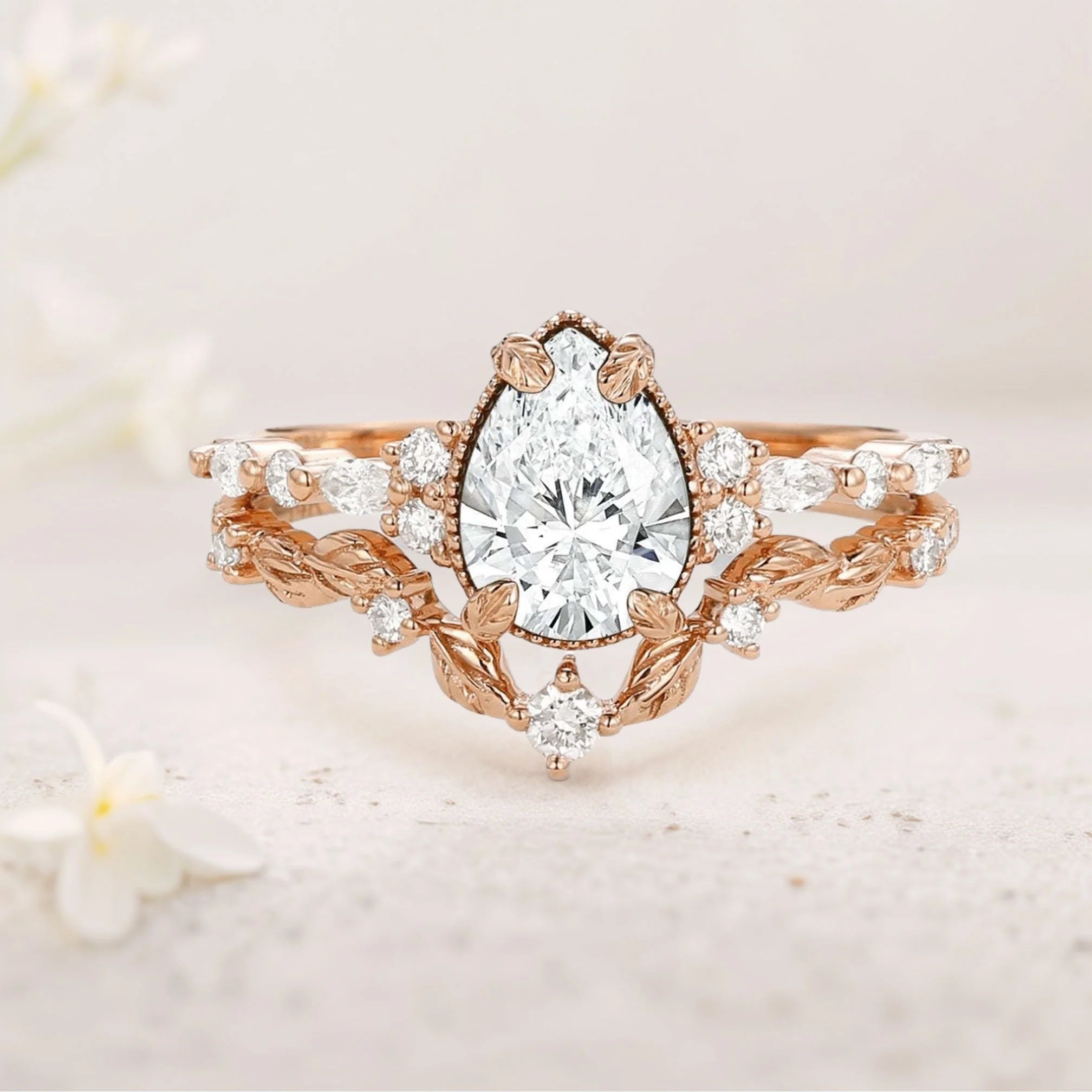 Vintage floral engagement rings Pear Moissanite Leafy Ring Set
