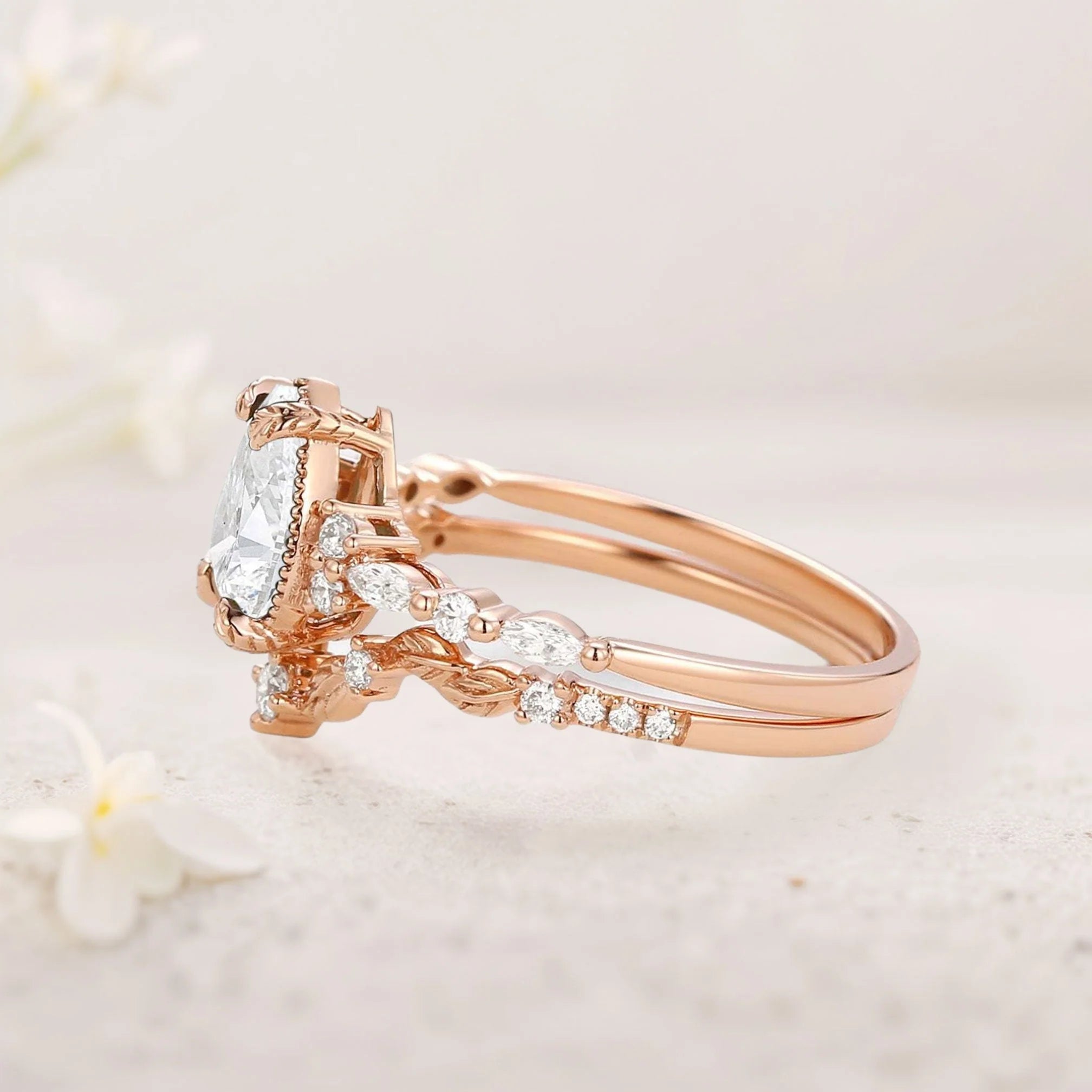 Vintage floral engagement rings Pear Moissanite Fairy Ring Set