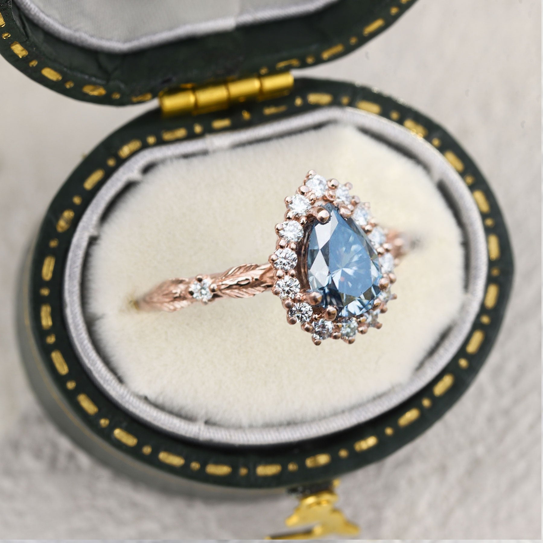 Unique Halo Leaf Pear Blue Grey Moissanite Ring