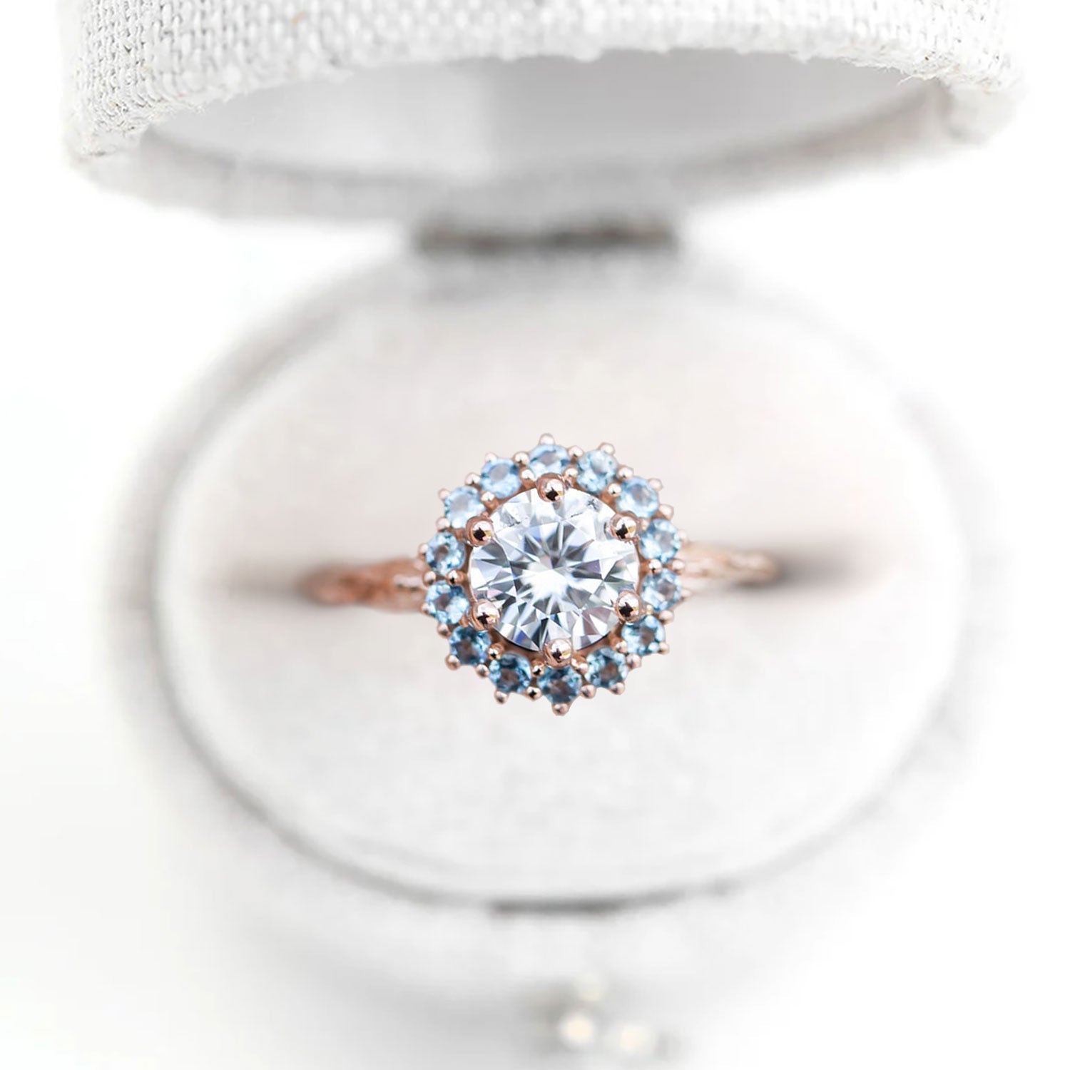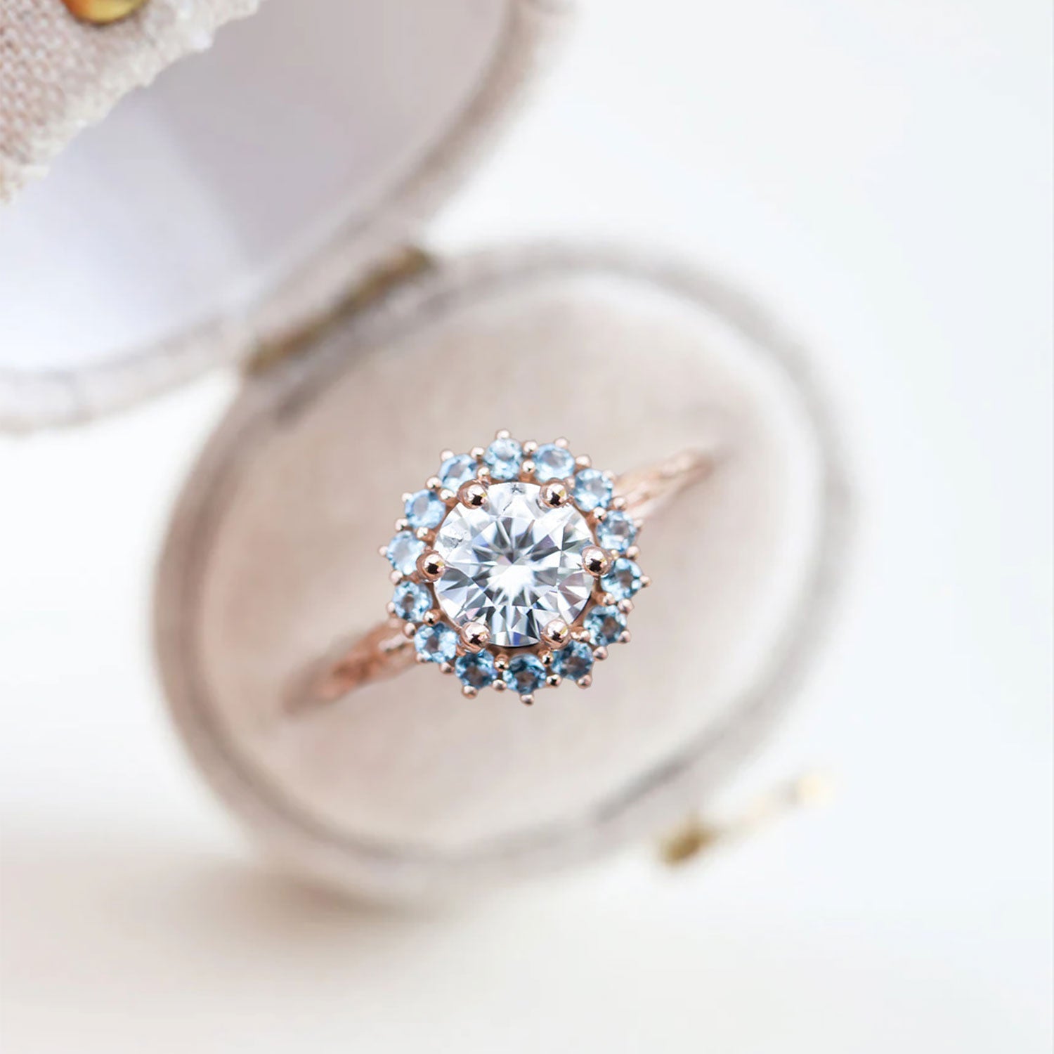 Unique Halo Midsummer Round Shaped Moissanite Ring