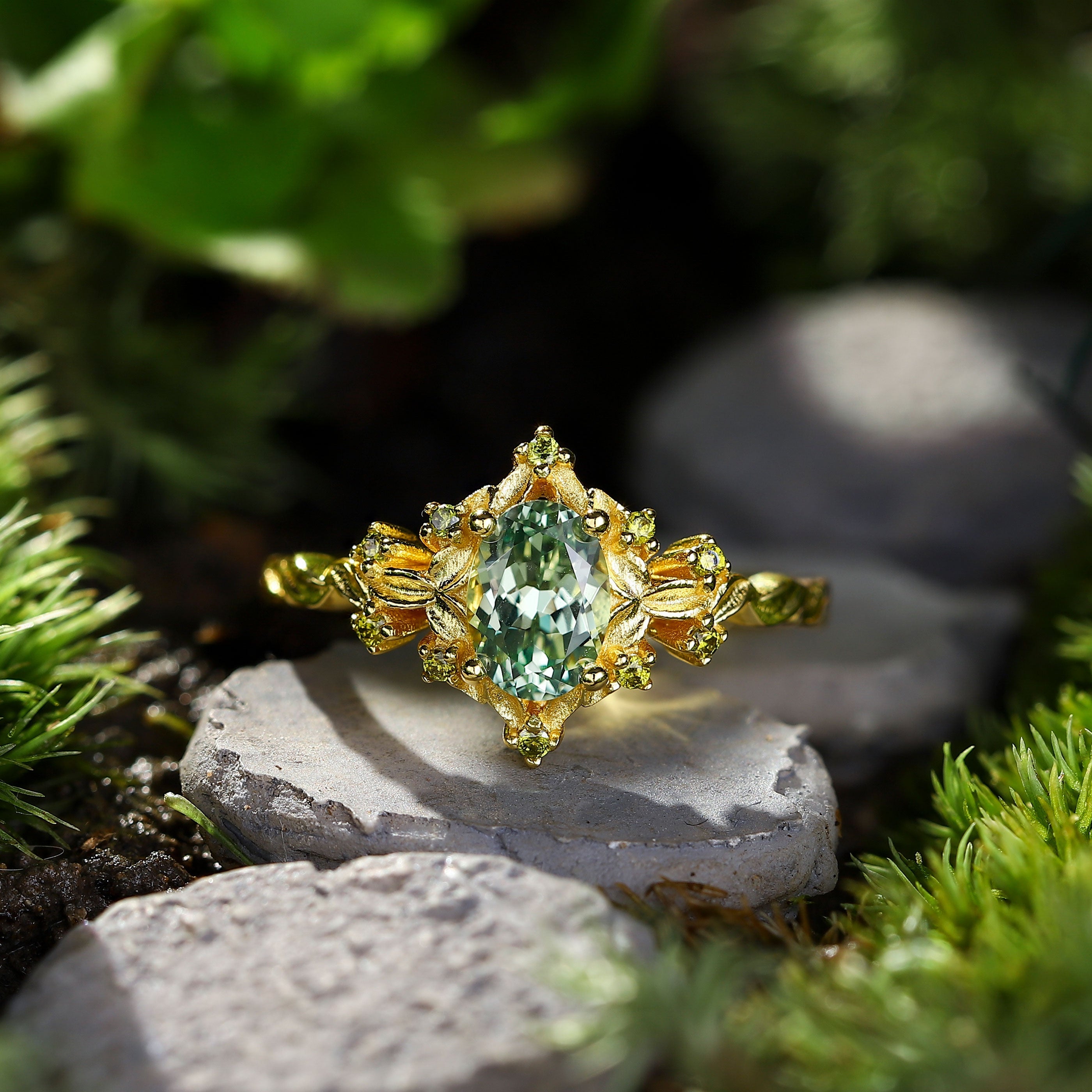 Unique Briar Rose Halo Oval Green Lab Sapphire Ring