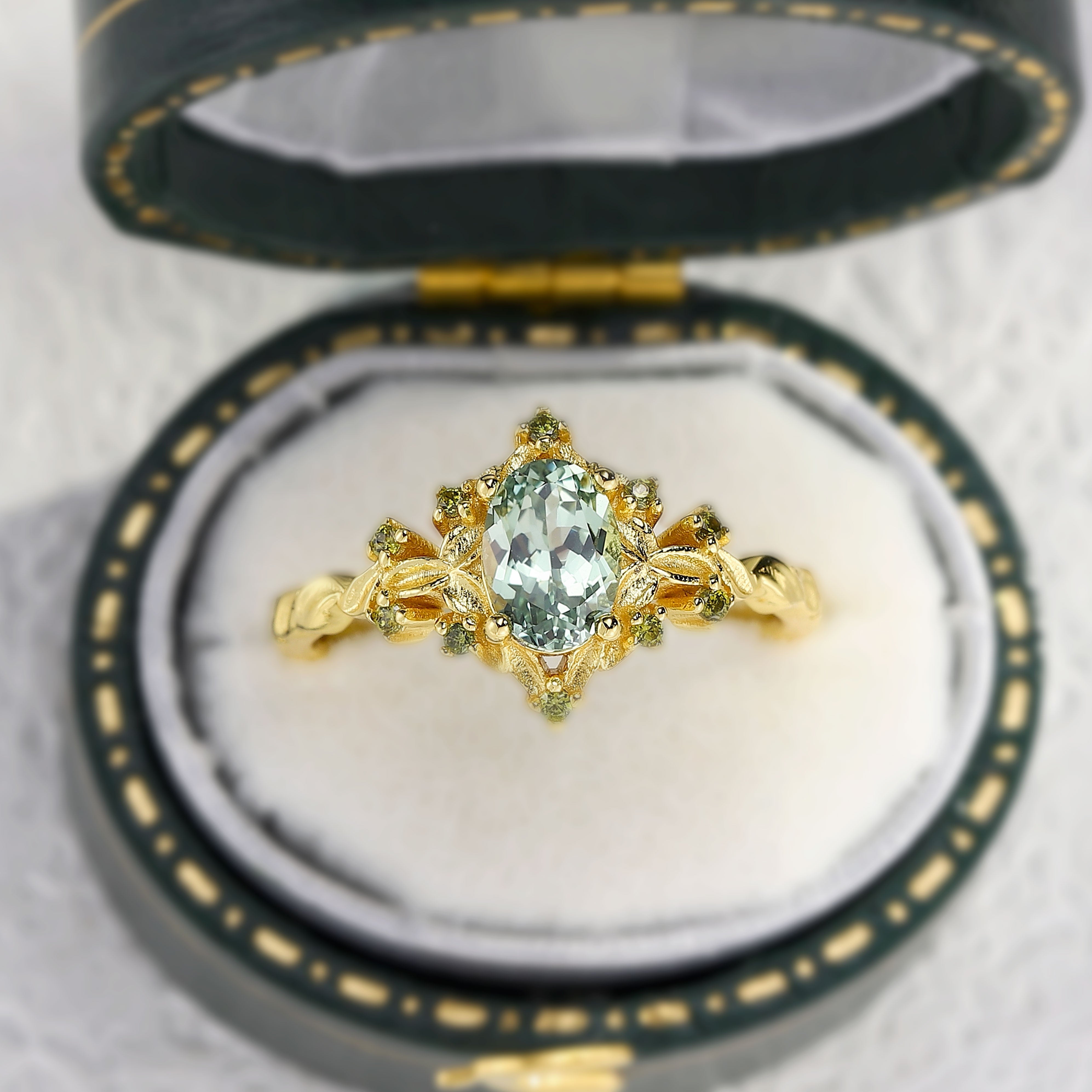 Unique Briar Rose Halo Oval Green Lab Sapphire Engagement Ring