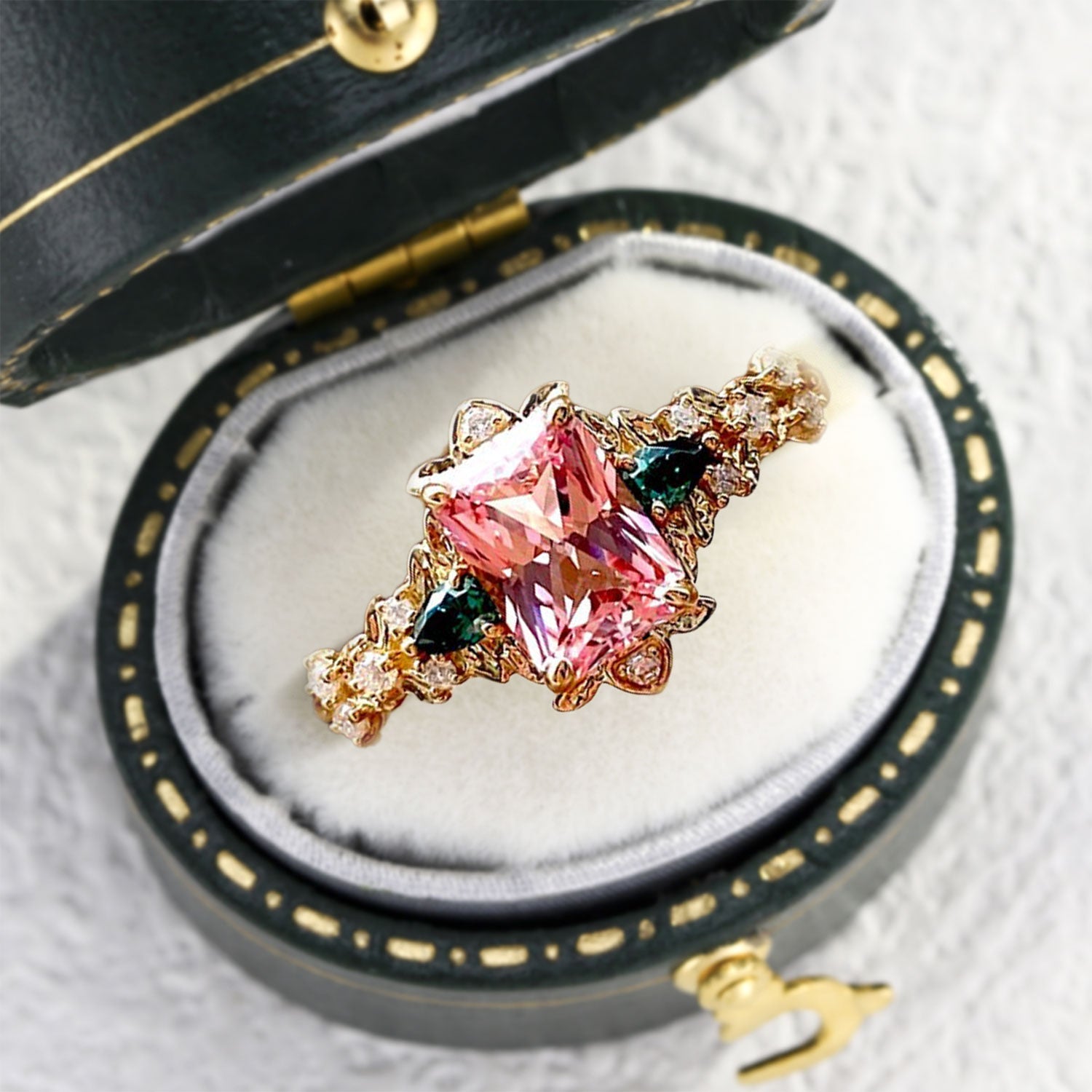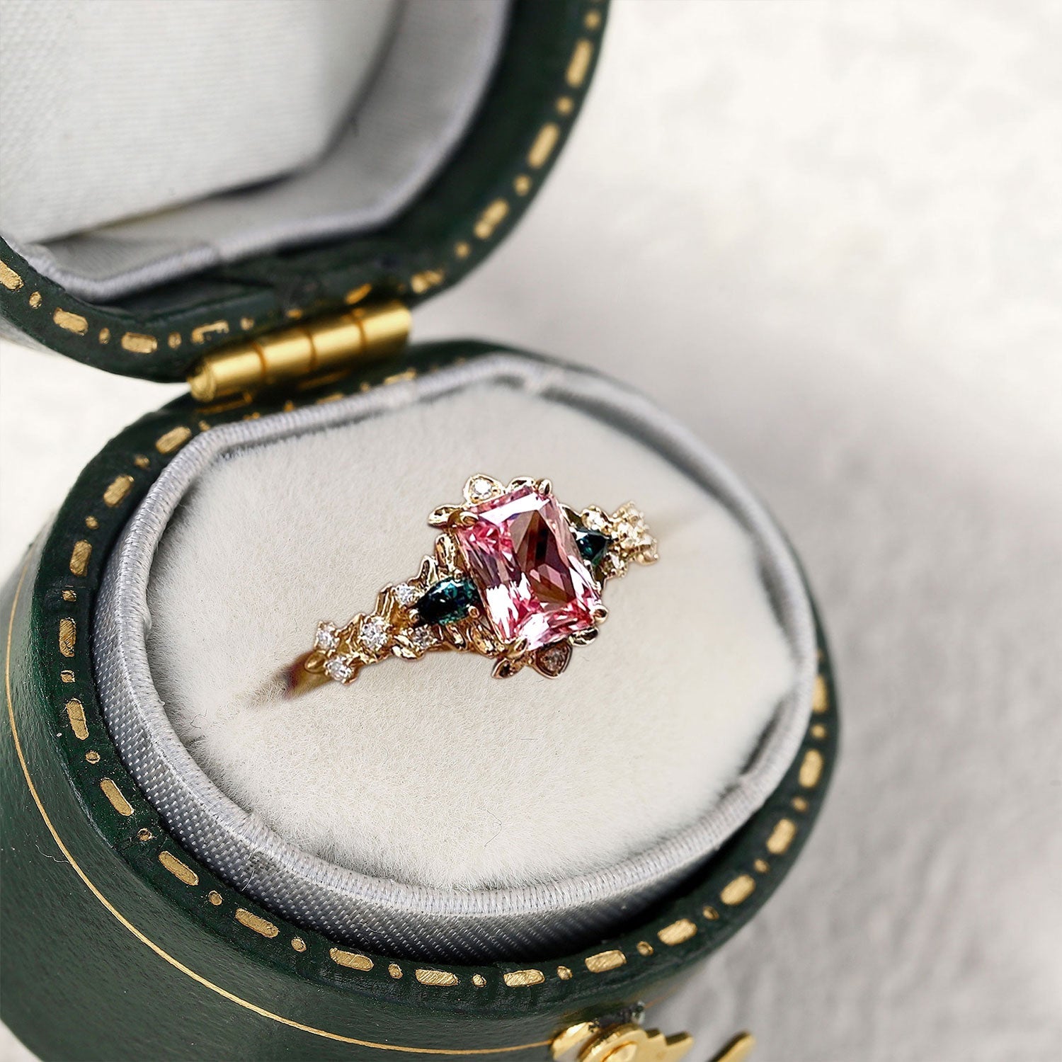 Vintage Emerald Cut Lab Padparadscha Engagement Ring Flower Wedding Ring