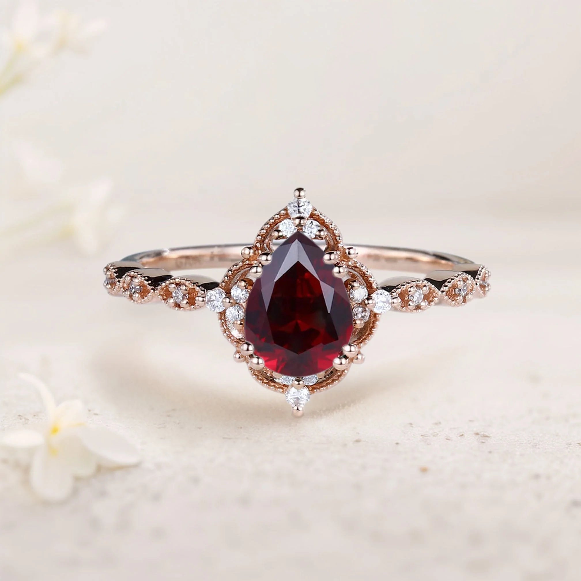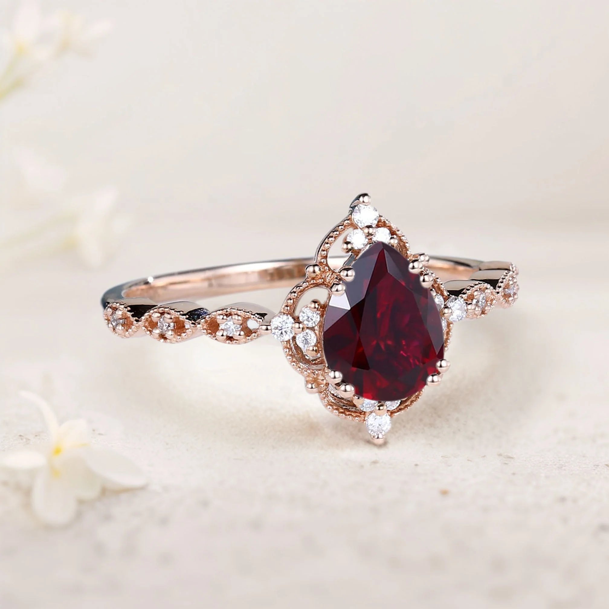 Vintage Pear Lab Ruby Engagement Ring Bridal Ring